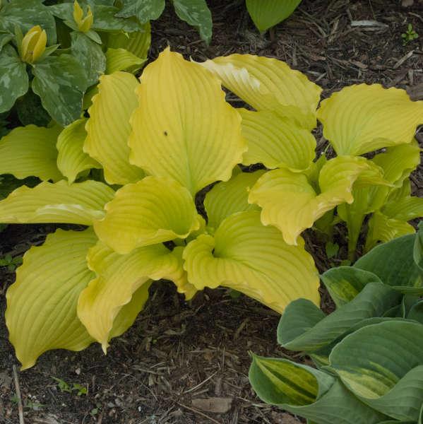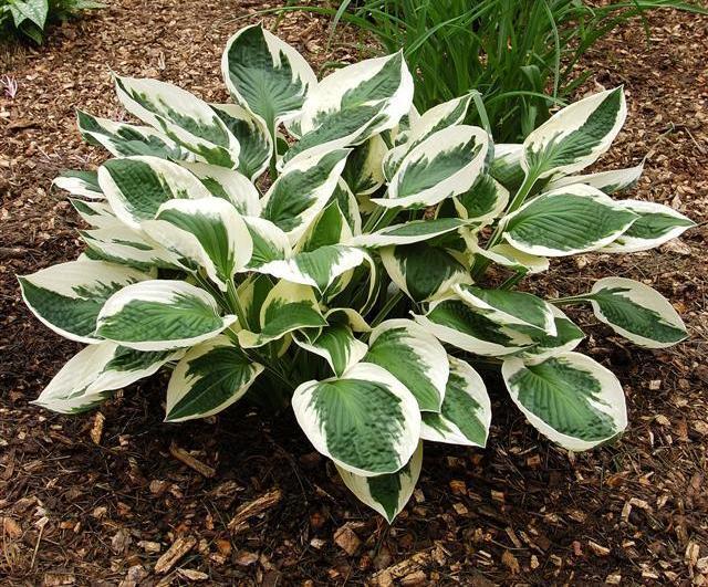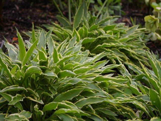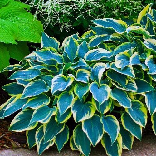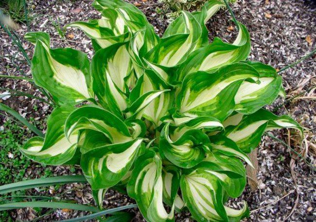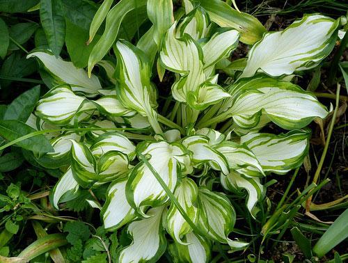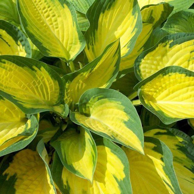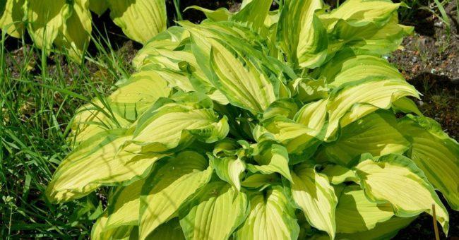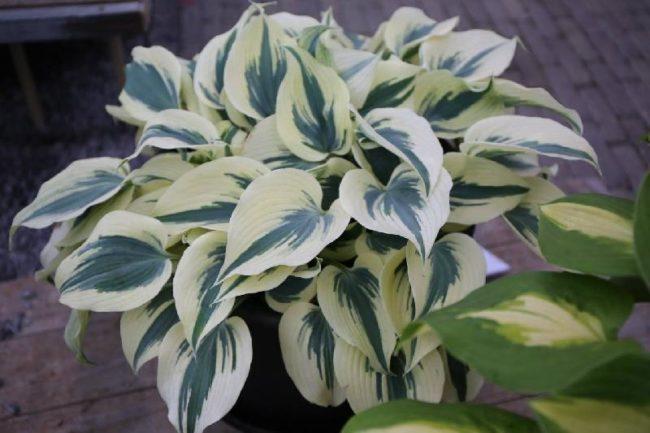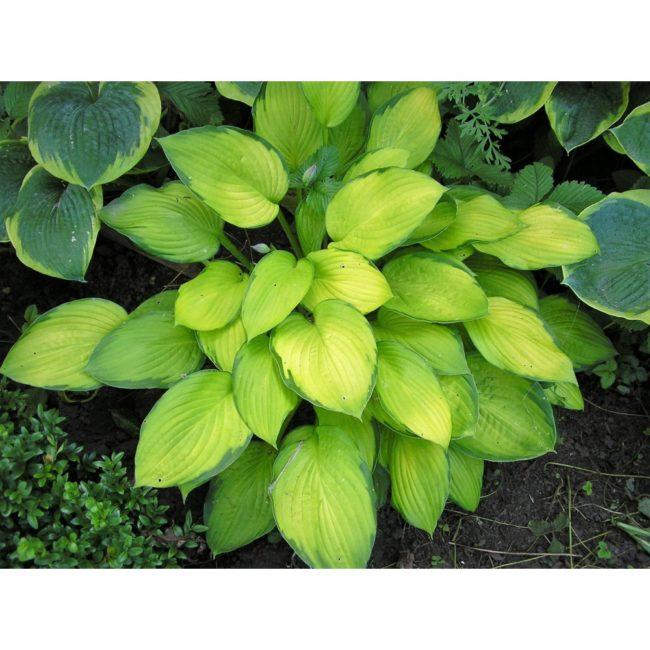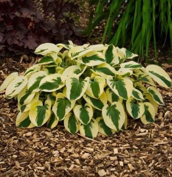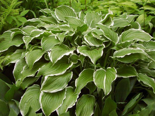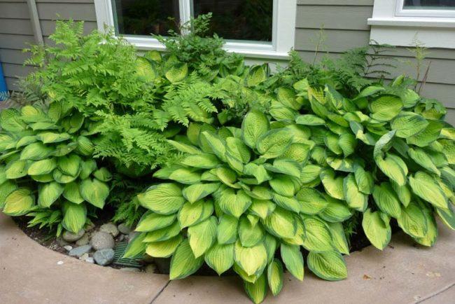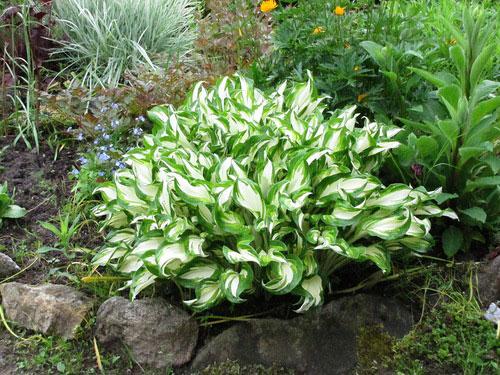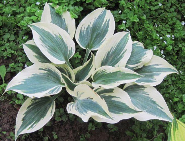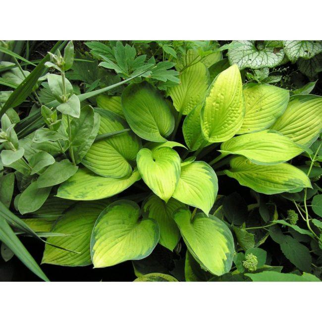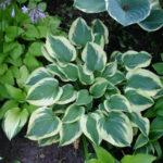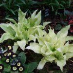 โฮสต้าลูกผสม First Frost เข้ากันได้ดีกับพืชที่มีสีเดียว