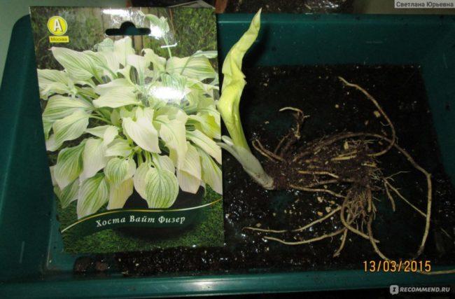 โฮสตามีชื่อเรียกในภาษาอังกฤษว่า "White Feather" ในช่วงเริ่มต้นของการเจริญเติบโต ใบของพันธุ์ White Feather จะเป็นสีขาว ต่อมาเส้นใบของไม้ล้มลุกจะเริ่มปรากฏให้เห็น ในช่วงปลายฤดูร้อน ใบของพันธุ์ "Feather" จะเริ่มมีสีเขียวมากขึ้นเรื่อยๆ
