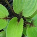 ใบของฟังเกียรูปหัวใจมีเส้นใบเด่นชัดเป็นสีน้ำเงิน ผิวใบทั้งหมดถูกปกคลุมด้วยสารเคลือบขี้ผึ้ง