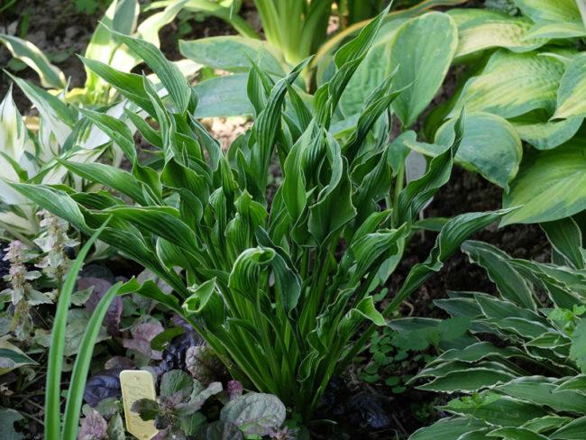 โฮสต้าที่มีใบหยิกใช้เป็นไม้ประดับสำหรับพืชผสมผสาน แปลงดอกไม้ และสไลเดอร์แบบอัลไพน์