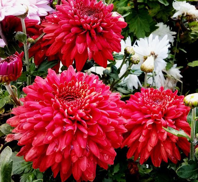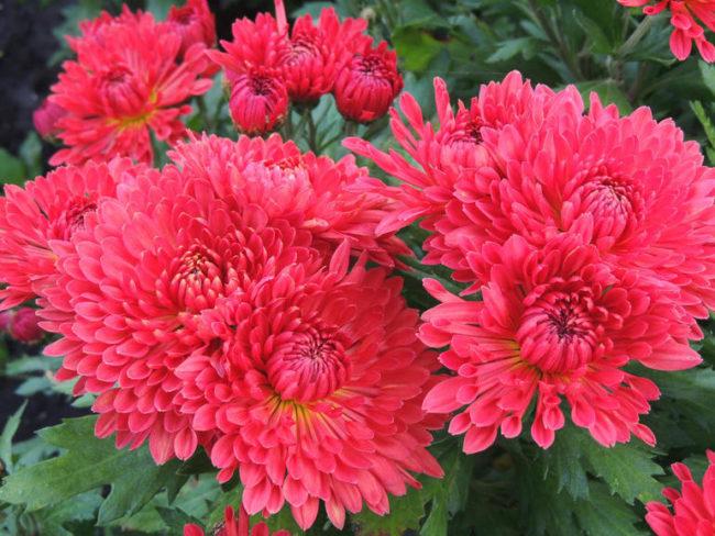 ดอกเบญจมาศเกาหลีสีแดงกอมปิใช้เป็นของตกแต่งสวนในฤดูใบไม้ร่วง