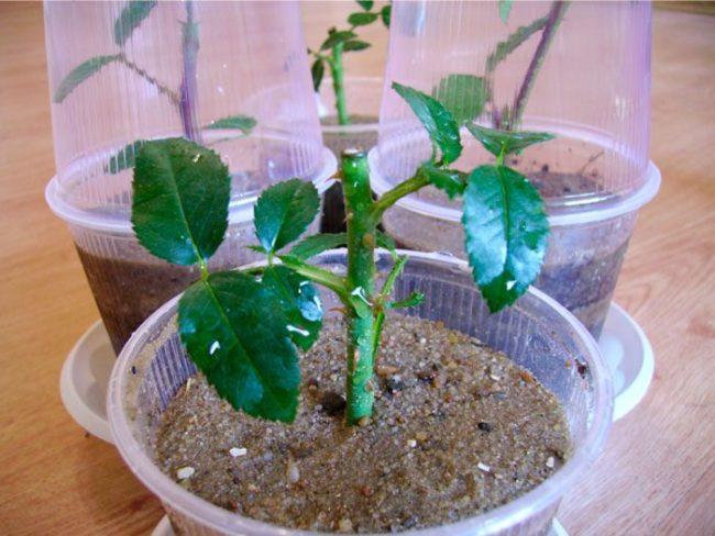 วิธีการใช้ดินคือการใช้ดินที่เตรียมไว้ ส่วนผสมสำหรับปักชำกุหลาบควรมีน้ำหนักเบาและร่วนซุยเพื่อให้กิ่งชำมีออกซิเจนเพียงพอ ปักชำลงในดินโดยเอียง คลุมด้วยพลาสติก แล้วเก็บไว้ในที่สว่าง