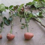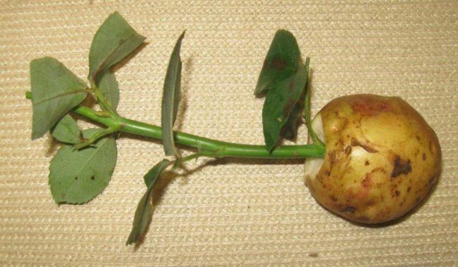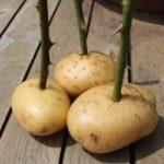 มันฝรั่งดิบสร้างสภาพแวดล้อมที่ชื้นและมีคุณค่าทางโภชนาการสำหรับกิ่งพันธุ์กุหลาบ ซึ่งส่งเสริมการแตกราก เจาะรูบนมันฝรั่งที่สะอาดเพื่อนำกิ่งพันธุ์ไปวาง วางมันฝรั่งลงบนดินที่ชื้น คลุมกระถางด้วยพลาสติกเพื่อสร้างบรรยากาศเรือนกระจก